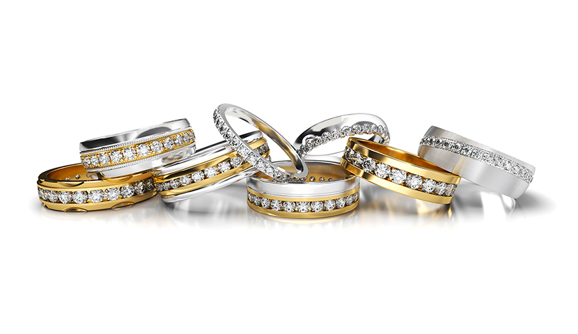 Damenring mit mittig gefassten Steinen (Diamanten, Zirkonia oder Lab-Diamanten), Herrenring mit feiner Linie und polierter Oberfläche.