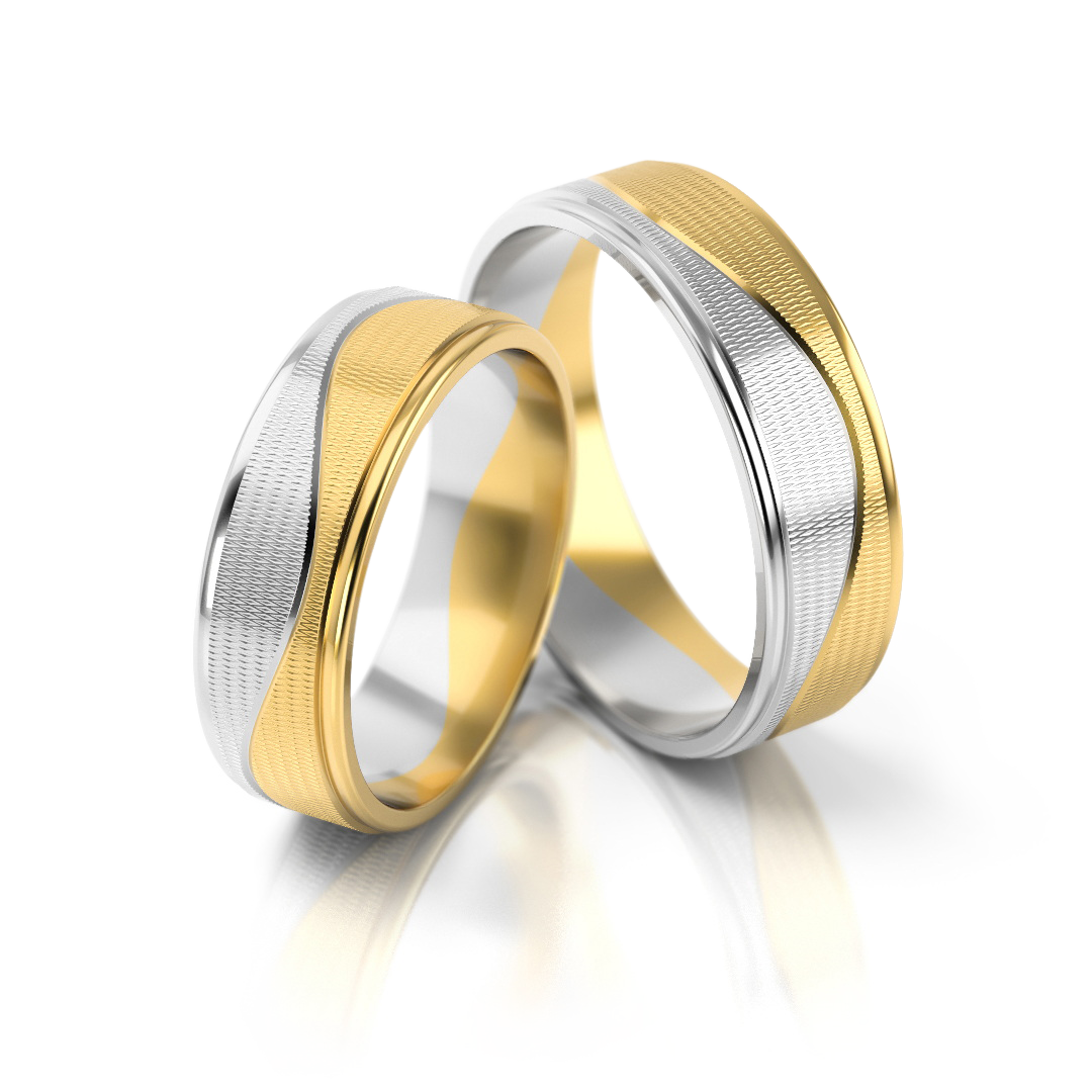 Die Eheringe Modell 199 aus der Linie „Flow“ verkörpern Bewegung, Harmonie und den natürlichen Rhythmus zweier verbundenen Leben. Die sanft geschwungene Bicolor-Gestaltung aus Gelb- und Weißgold verläuft in einer eleganten Wellenform um den Ring und erzeugt ein fließendes, dynamisches Erscheinungsbild. Die fein strukturierte Oberfläche verstärkt diesen Effekt und lässt die Ringe je nach Lichteinfall lebendig schimmern.