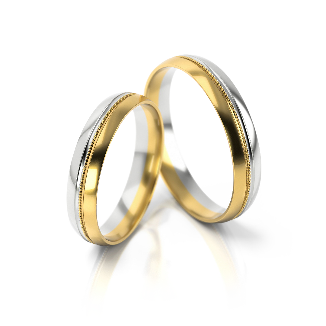 Klassische Bicolor-Eheringe in Weiß- und Gelbgold mit 4 mm Breite. Modell 253 mit eleganter Perlfuge – stilvolle Trauringe für zeitlose Liebe.