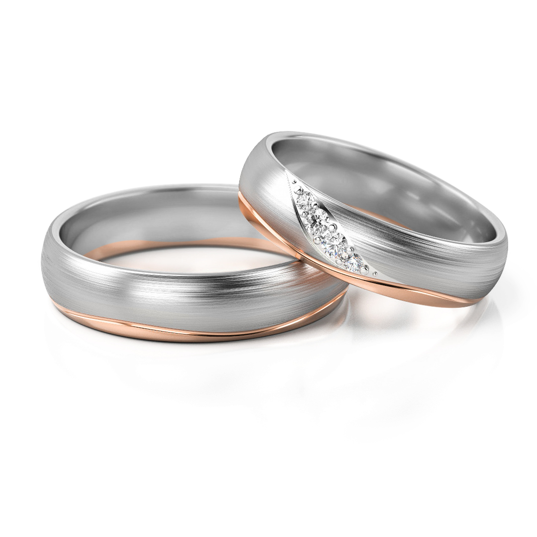 Elegante Trauringe Nr. 283 Weißgold-Roségold mit sanftem Linienmotiv und funkelndem Steinbesatz im Damenring. Die geschwungene Form symbolisiert Verbindung, Harmonie und gemeinsame Bewegung. Erhältlich in Gelbgold, Weißgold, Roségold sowie in der edlen Bicolor-Variante.