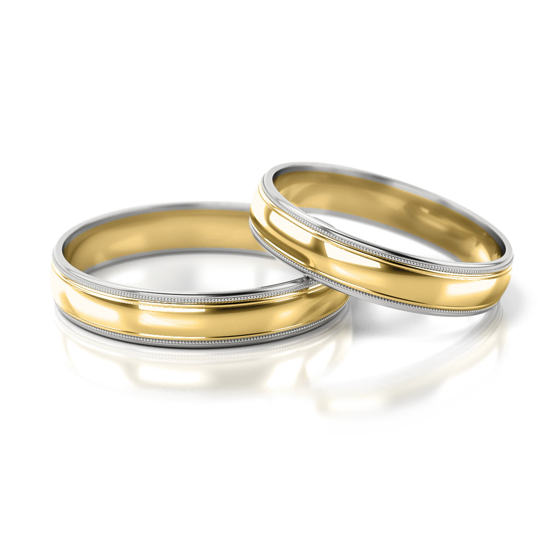 Klassische Eheringe in Weißgelbgold ohne Steine. Modell 241 mit 4 mm Breite, elegantes Bicolor-Design mit feinen Zierlinien. Zeitlose Trauringe für Paare, die schlichte Eleganz lieben.