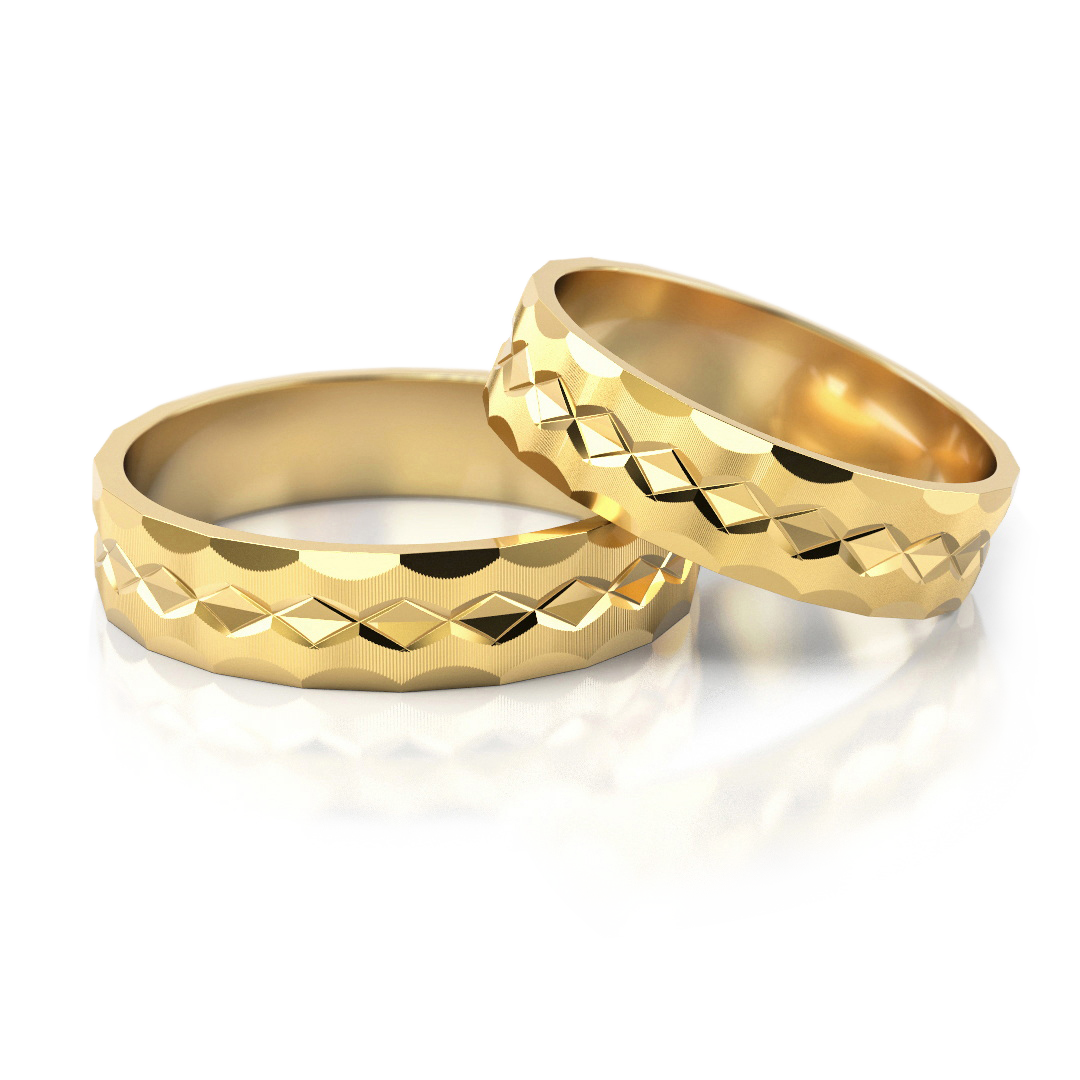 Die Trauringe Modell 22 aus der Linie Minimalistisch stehen für klare Formen, reduzierte Eleganz und zeitlose Schönheit. Das Design überzeugt durch eine fein strukturierte Oberfläche mit geometrischem Schliff, der dem Gelbgold eine besondere Tiefe und lebendige Lichtreflexe verleiht. Trotz der markanten Textur bleibt die Formsprache ruhig und harmonisch – ideal für Paare, die minimalistisches Design mit Charakter schätzen.