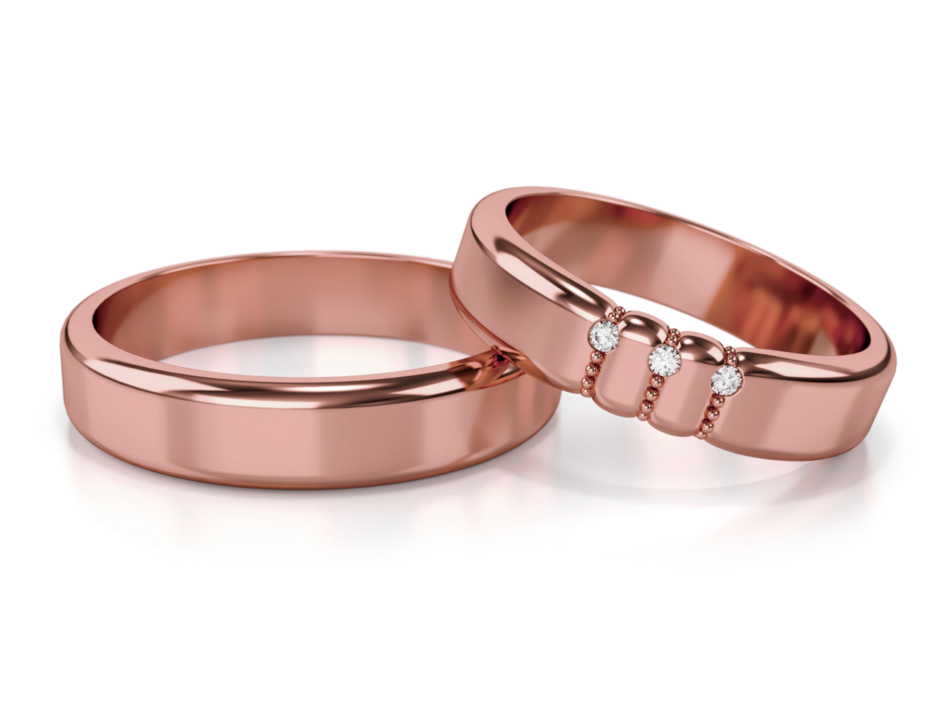 Die Eheringe Modell 332 aus der Linie „Neuheiten“ verbinden klassisches Gold mit einem modernen, frischen Design. Die sanft abgerundete Form und die hochglanzpolierte Oberfläche verleihen den Ringen eine besonders elegante Ausstrahlung. Der Damenring wird durch drei funkelnde Steine mit insgesamt 0.045 ct veredelt, die dezent in das Design integriert sind und für einen stilvollen Akzent sorgen.