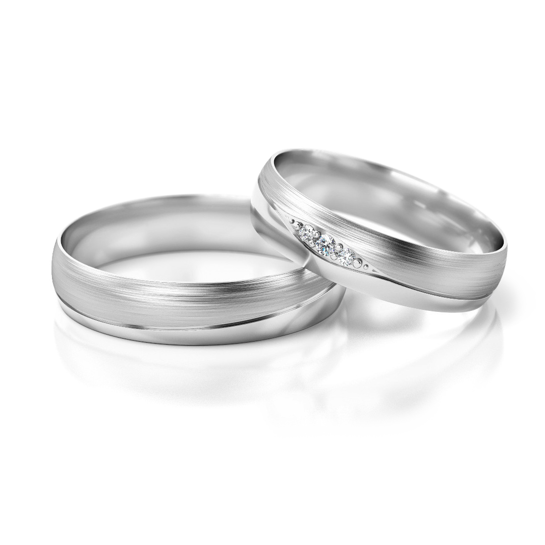 Trauringe Nr. 275 mit fließendem V-Motiv, das Wellenbewegung, Verbindung und Symbiose symbolisiert. Die harmonische Linienführung und der dezente Steinbesatz im Damenring verleihen dem klassischen Design eine moderne, bedeutungsvolle Tiefe. Erhältlich in Gelbgold, Weißgold, Roségold sowie in verschiedenen Bicolor-Varianten. Breite: 4,5 mm, Höhe: 1,3 mm, Gesamtgewicht der Steine: ca. 0,035 ct