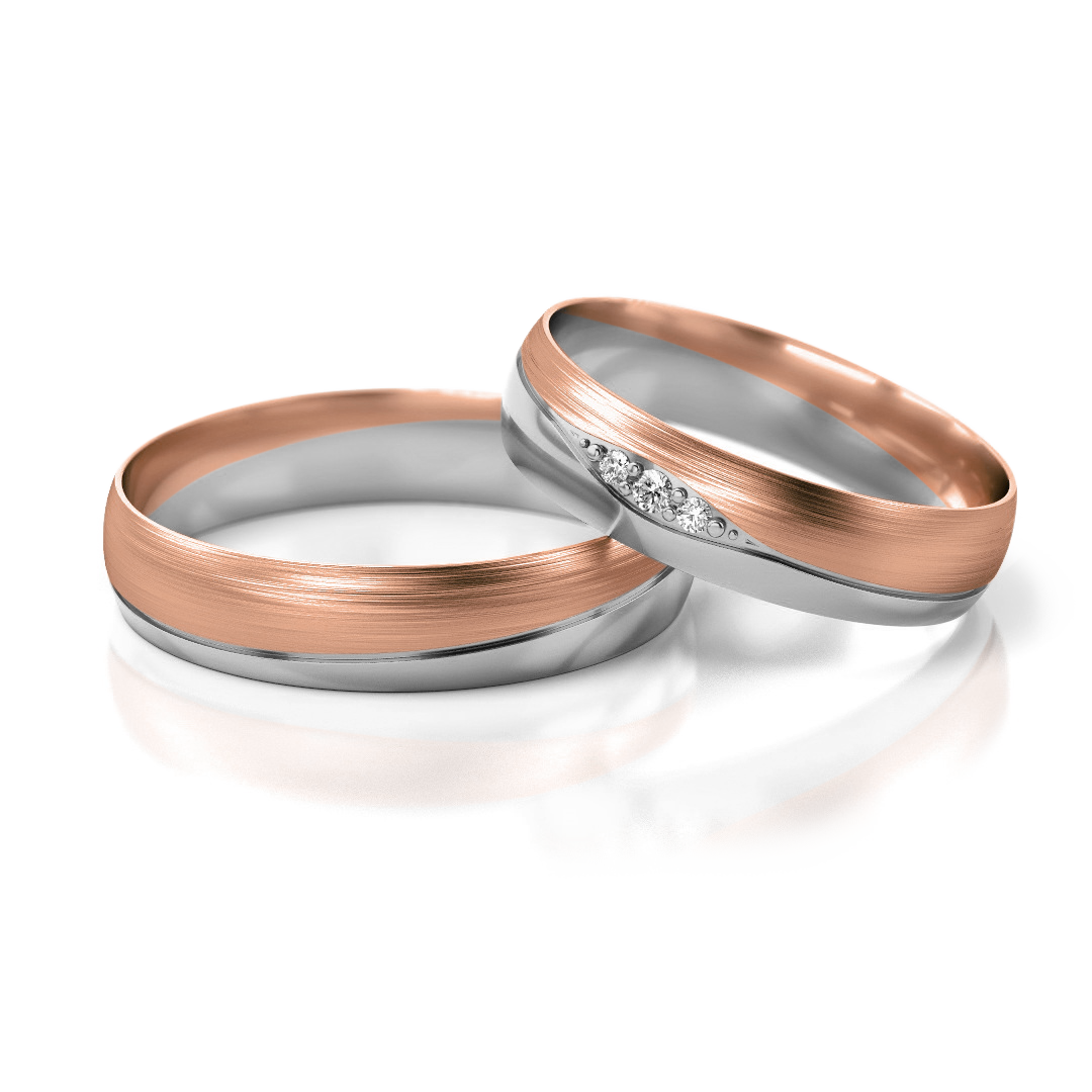 Trauringe Nr. 275 mit fließendem V-Motiv, das Wellenbewegung, Verbindung und Symbiose symbolisiert. Die harmonische Linienführung und der dezente Steinbesatz im Damenring verleihen dem klassischen Design eine moderne, bedeutungsvolle Tiefe. Erhältlich in Gelbgold, Weißgold, Roségold sowie in verschiedenen Bicolor-Varianten. Breite: 4,5 mm, Höhe: 1,3 mm, Gesamtgewicht der Steine: ca. 0,035 ct