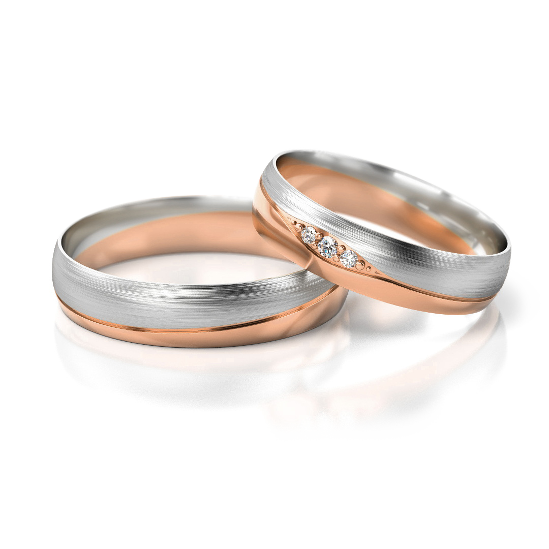 Trauringe Nr. 275 mit fließendem V-Motiv, das Wellenbewegung, Verbindung und Symbiose symbolisiert. Die harmonische Linienführung und der dezente Steinbesatz im Damenring verleihen dem klassischen Design eine moderne, bedeutungsvolle Tiefe. Erhältlich in Gelbgold, Weißgold, Roségold sowie in verschiedenen Bicolor-Varianten. Breite: 4,5 mm, Höhe: 1,3 mm, Gesamtgewicht der Steine: ca. 0,035 ct