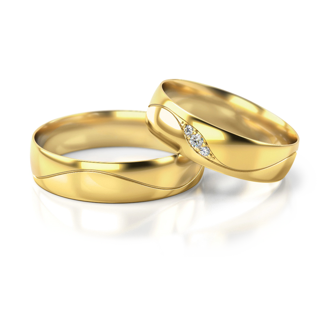 Die Trauringe Nr. 276 aus Gelbgold verbinden warme Eleganz mit einem modernen FLOW-Design. Das sanft verlaufende Wellenmotiv symbolisiert Harmonie, Verbundenheit und die ruhige Kraft einer beständigen Beziehung. Der Damenring trägt drei präzise gefasste Steine, die sich perfekt in das Blatt-Wellenmotiv integrieren und das Design zum Leben erwecken. Gelbgold verleiht den Ringen einen klassischen, sonnigen Charakter, der zeitlos und emotional wirkt.