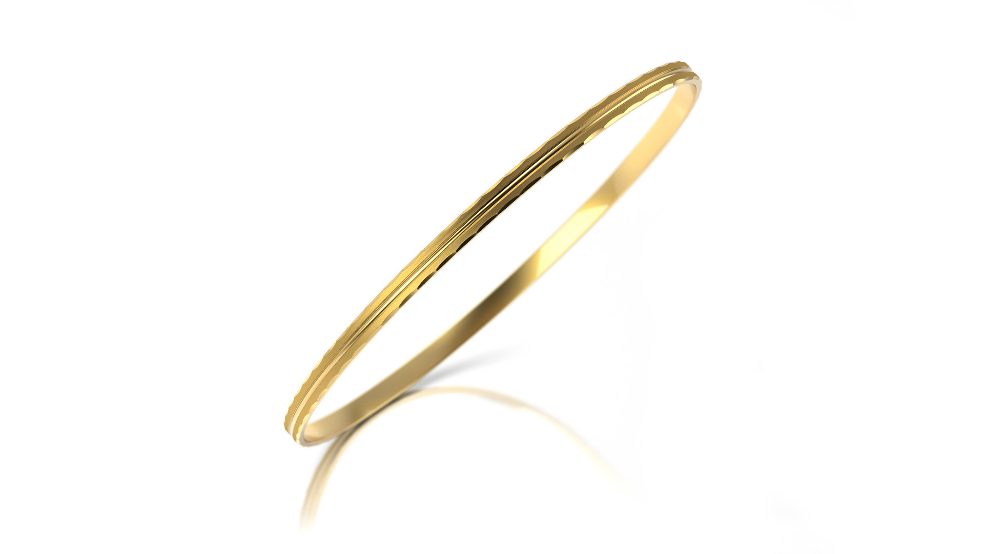 Armband 1007 ist ein sehr schlankes, elegantes Gelbgoldarmband mit einem feinen, dreifach verlaufenden Linienmuster entlang des Randes. Die polierten Linien setzen dezente Lichtakzente und verleihen dem schmalen Armreif eine filigrane, edle Erscheinung. Durch seine zarte Breite eignet sich das Design perfekt zum Stapeln mit anderen Armreifen oder als minimalistisches Einzelstück.