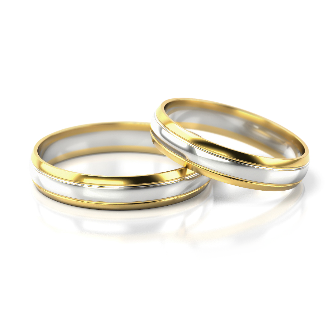 Klassische Eheringe in Weißgelbgold ohne Steine. Modell 241 mit 4 mm Breite, elegantes Bicolor-Design mit feinen Zierlinien. Zeitlose Trauringe für Paare, die schlichte Eleganz lieben.