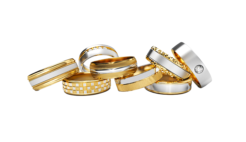 Zentral ist das Zusammenspiel zweier Farben: Weißgold und Gelbgold werden nicht dekorativ, sondern bewusst grafisch eingesetzt. Klare Linien, flache Übergänge und präzise Kanten erzeugen ein harmonisches Bild. Die beiden Goldtöne spielen miteinander, ohne sich gegenseitig zu überlagern – ein Gleichgewicht, das die Beziehung zweier Menschen widerspiegelt.