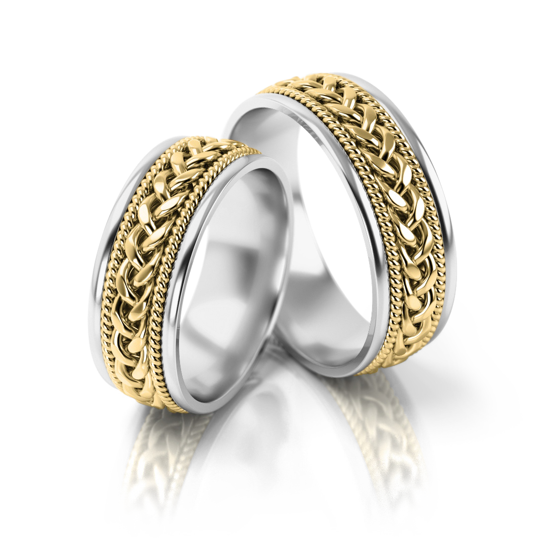 Das Zusammenspiel von Gelbgold und Weißgold unterstreicht den Vintage-Charakter und verleiht dem Flechtmuster Tiefe und Ausdruckskraft. Ein Ringpaar, das für Harmonie, Liebe und handwerkliche Qualität steht – zeitlos und einzigartig.