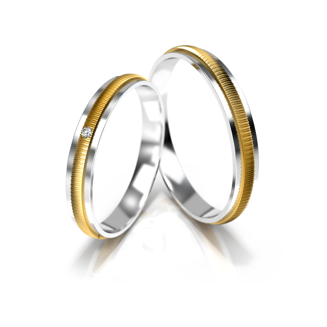 Klassische, schmale Eheringe in Gelb-Weißgold. Modell 328 mit 3 mm Breite, zartem 0.01 ct Stein im Damenring, erhältlich in zwei Bicolor-Varianten und den Legierungen 333 bis 750.