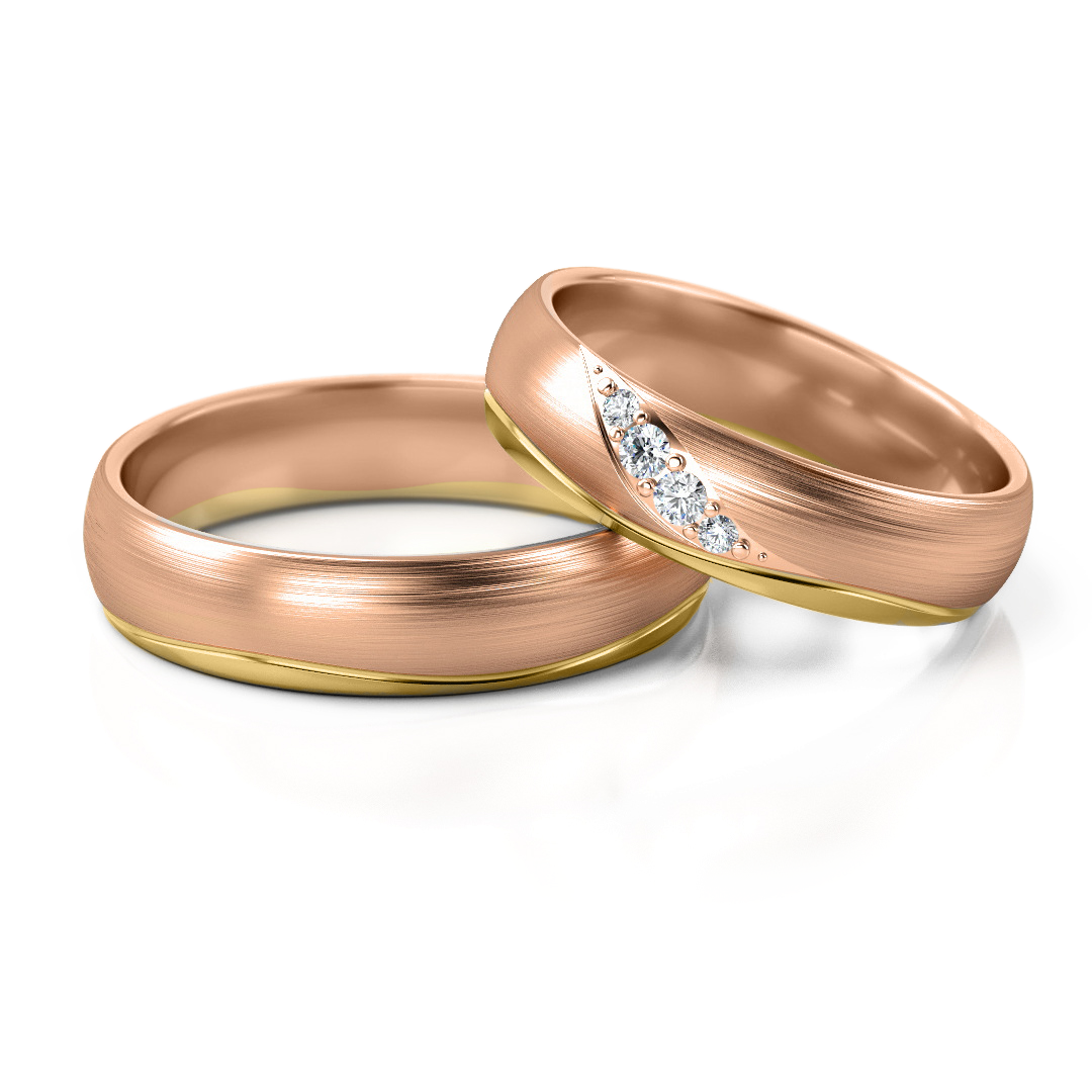 Elegante Trauringe Nr. 283 in Roségold-Gelbgold mit sanftem Linienmotiv und funkelndem Steinbesatz im Damenring. Die geschwungene Form symbolisiert Verbindung, Harmonie und gemeinsame Bewegung. Erhältlich in Gelbgold, Weißgold, Roségold sowie in der edlen Bicolor-Variante.