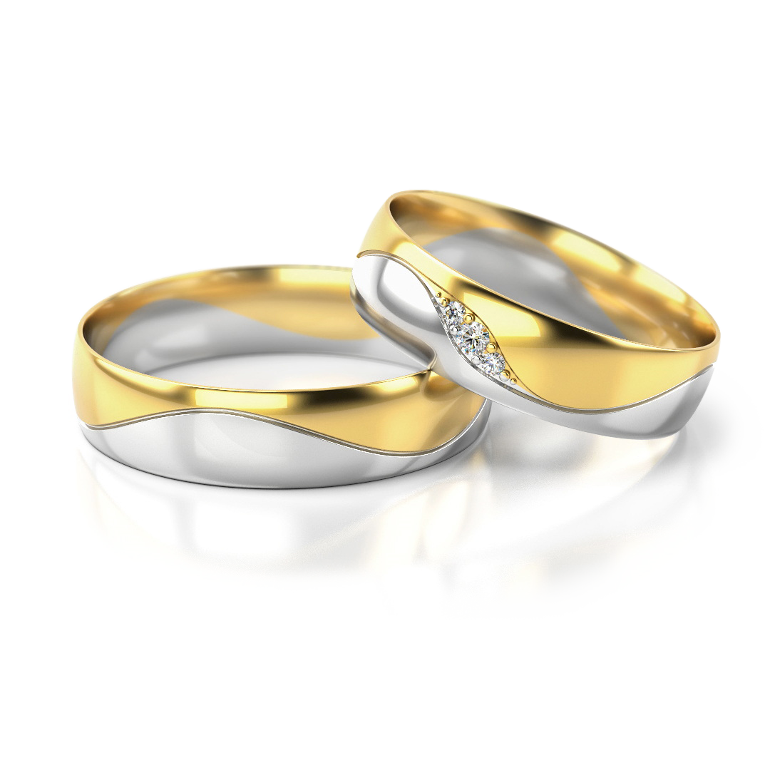 Die zweifarbigen Trauringe Nr. 276 aus Gelbgold und Weißgold verbinden Wärme und Klarheit in einem harmonischen FLOW-Design. Das fließende Wellenmotiv hebt die beiden Goldfarben subtil hervor. Der Damenring mit drei funkelnden Steinen fügt sich spielerisch in die weiche Linienführung ein. Die Bicolor-Optik verleiht Tiefe und Charakter – ein Symbol für zwei Persönlichkeiten, die perfekt zusammenpassen.