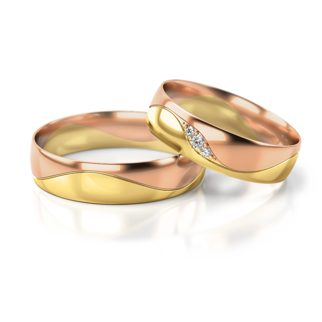 Die zweifarbigen Trauringe Nr. 276 in Roségold und Gelbgold kombinieren die warme Tiefe des Roségoldes mit der klassischen Helligkeit von Gelbgold. Das fließende Wellenmotiv verbindet beide Farben zu einem harmonischen Gesamtbild. Der Damenring ist mit drei glitzernden Steinen geschmückt, die perfekt in das stilisierte Blattmotiv passen. Das Design wirkt warm, weich und äußerst lebendig.