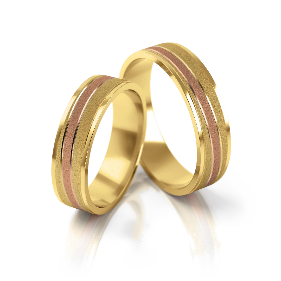 Die Trauringe aus echtem Gelbgold und Roségold (333, 375, 585 oder 750) verbinden zurückhaltendes Design mit moderner Ästhetik. Die mattierte Oberfläche wird durch feine, polierte Linien dezent akzentuiert und sorgt so für eine zeitgemäß-elegante Optik.