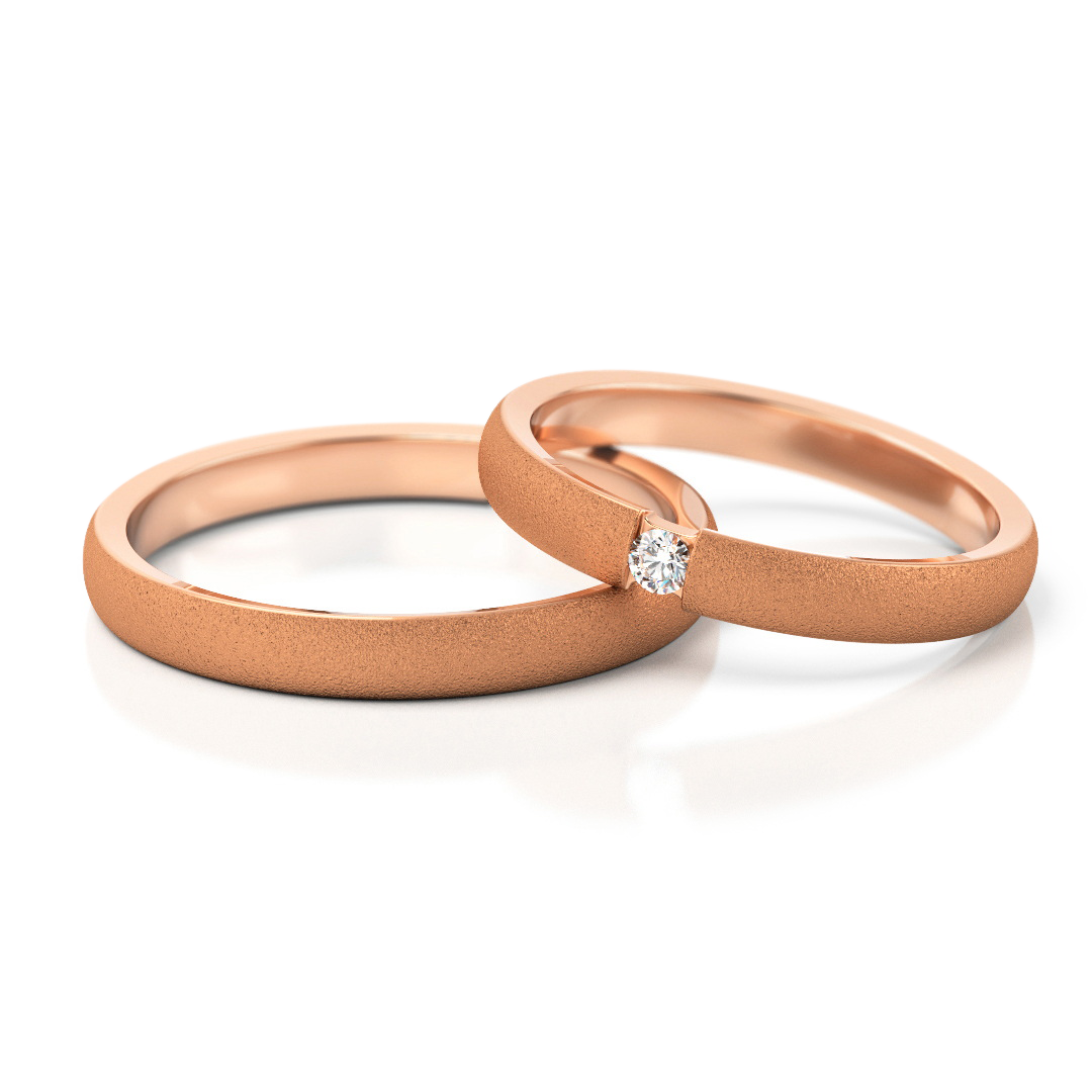 Elegante Eheringe in Roségold, erhältlich in den Legierungen 333 bis 750. Der Damenring ist mit einem 0.03 ct Stein wählbar: Diamant, Labordiamant . Zeitloses Design, 3 mm breit, perfekt für Paare, die schlichte und hochwertige Trauringe suchen.